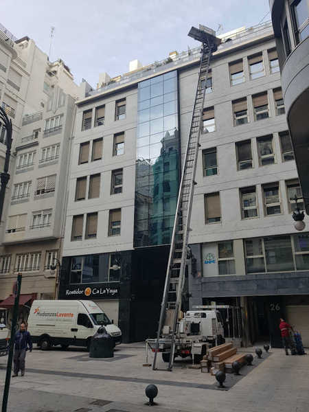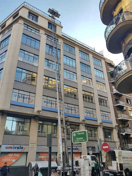 Ademas de alcanzar la mayor altura en la ciudad de Valencia, realizamos servicios que nadie mas puede hacer, debido a que no tienen ni los sistemas de acople en diagonal ni la el elevador mas robusto y potente del mercado español.